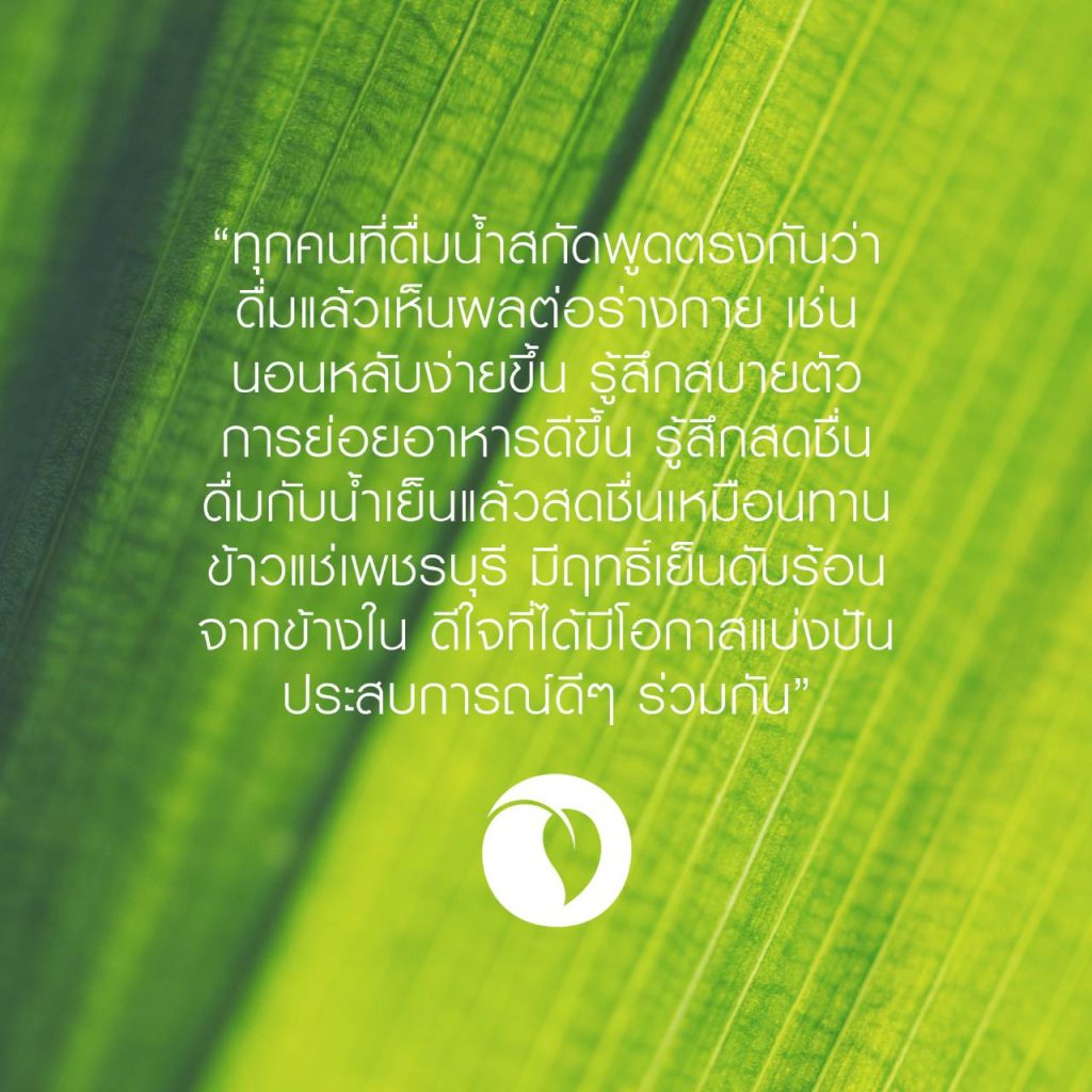 “ทุกคนที่ดื่มน้ำสกัดพูดตรงกันว่าดื่มแล้วเห็นผลต่อร่างกาย เช่น นอนหลับง่ายขึ้น รู้สึกสบายตัว การย่อยอาหารดีขึ้น รู้สึกสดชื่น ดื่มกับน้ำเย็นแล้วสดชื่นเหมือนทานข้าวแช่เพชรบุรี มีฤทธิ์เย็นดับร้อนจากข้างใน ดีใจที่ได้มีโอกาสแบ่งปันประสบการณ์ดีๆ ร่วมกัน”