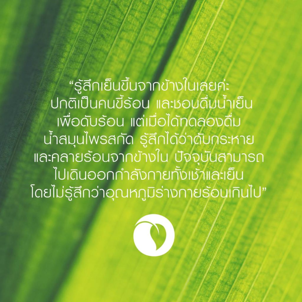 “รู้สึกเย็นขึ้นจากข้างในเลยค่ะ ปกติเป็นคนขี้ร้อน และชอบดื่มน้ำเย็นเพื่อดับร้อน แต่เมื่อได้ทดลองดื่มน้ำสมุนไพรสกัด รู้สึกได้ว่าดับกระหายและคลายร้อนจากข้างใน ปัจจุบันสามารถไปเดินออกกำลังกายทั้งเช้าและเย็น โดยไม่รู้สึกว่าอุณหภูมิร่างกายร้อนเกินไป”